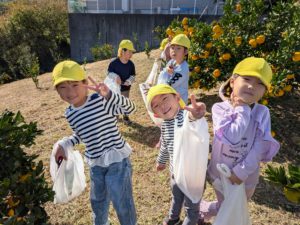 ばらぐみさんは、「ここに美味しそうなみかんあるよ!」とゆりぐみさんを呼んでいました。みんなで協力して、たくさんのみかんを採らせていただきました。