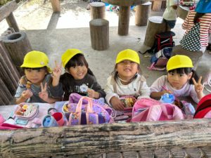 ゆりぐみさんとばらぐみさんは断層公園まで歩いて行き、お弁当を食べました。