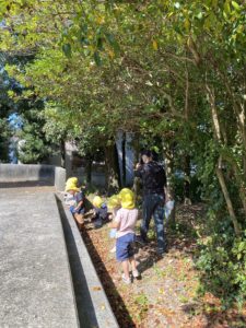 すみれぐみさんは、忠霊塔までお散歩です。秋の風を感じながら、青空礼拝をしました。どんぐりもたくさん拾いましたよ。